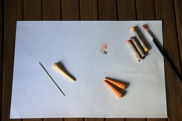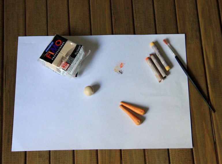 Лучше и логичнее всего взять оранжевый Фимо (классик, софт или кидс все равно). Но мы не ищем легких путей, у меня был белый, скатала из него шарик. Важно, чтобы руки и поверхность были чистыми, без мусора и пыли. После шарик преобразуем в конус (стала катать его как бы с одной стороны) и доводим примерно до формы морковки - на какую фантазии хватит. Свою морковку я еще дополнила насечками (ножом) - для правдоподобия. Толстой иглой аккуратно проколола насквозь отверстие - ближе к основанию, чтобы потом за него пришить нос к голове. Пастельные мелки (у меня оранжевый, желтый, корчиневый) покрошила лезвием по чуть-чуть, смешала кисточкой маленькой и нанесла легкими похлопывающими движениями. Прокрасила морковь, положила ее на картонку, убрала в холодильник на 15 мин. Включила духовку, разогрела до 110град примерно. Упаковала морковку в рукав для запекания, плотно-плотно завязяла там. Помним, что запекаемый пластик может при нагревании выделять некие неполезные вещества, которые оседают на стенках духовки и потом могут попасть в пищу. Для меня это выражается в вони, которая есть, когда откроешь пакет с "выпечкой" из фимо.