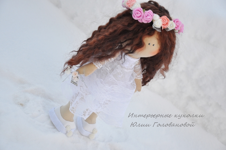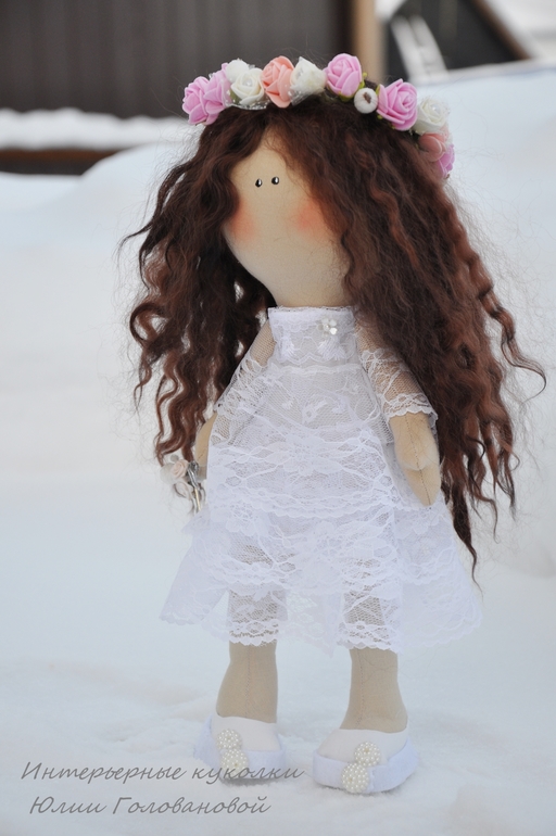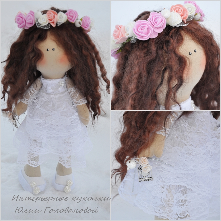 ТыквоголовочкиСама нежность. Кукла с элементами портретного сходства. Волосы из натуральной шерсти, цветочный венок. Платье гипюр и кружево. В ручке миниатюрная клеточка. Шьется в паре с куколкой-дочкой. Дочка будет чуть позже)).