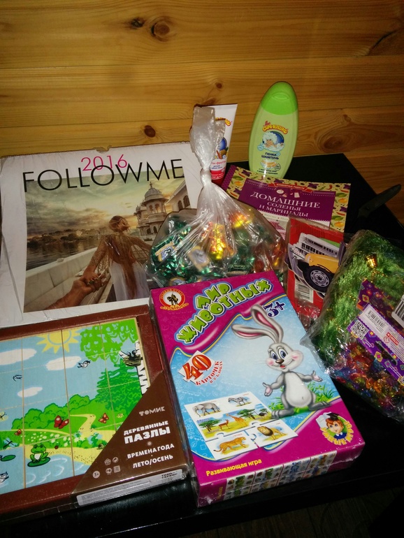 1. осень: деревянные пазлы и журнал с домашними соленьями)2. путешествие: календарь с разными видами)и игра "Мир животных"3. транспорт: игра для Тима4. солнце: косметика "Мое солнышко"5. ручная работа: Ёлка для шампанского и мелочи для рукоделия.А конфетки для сладости)))