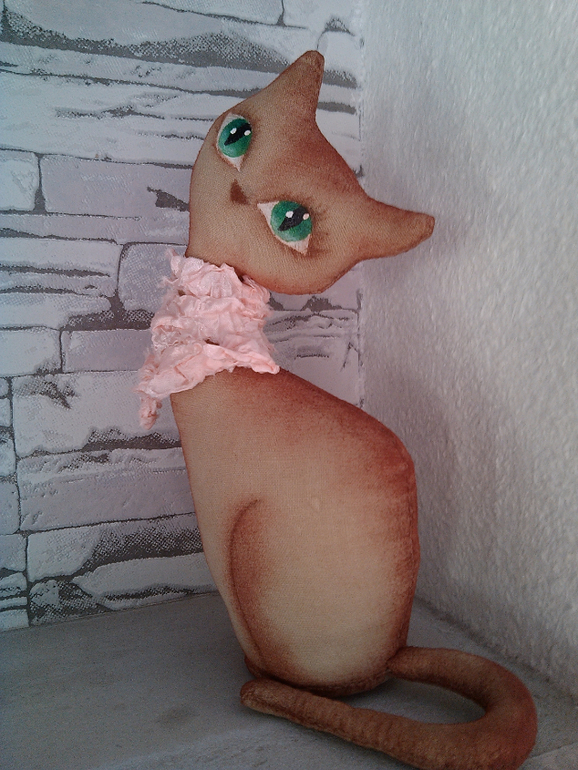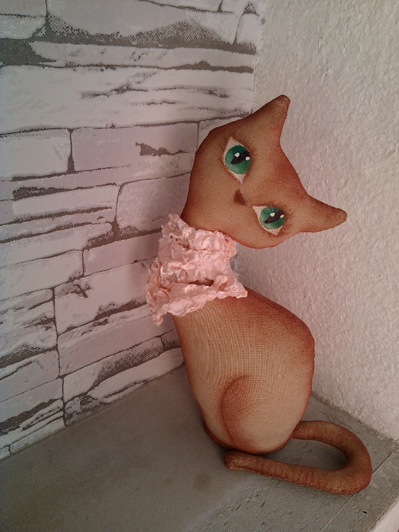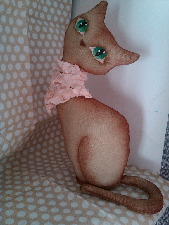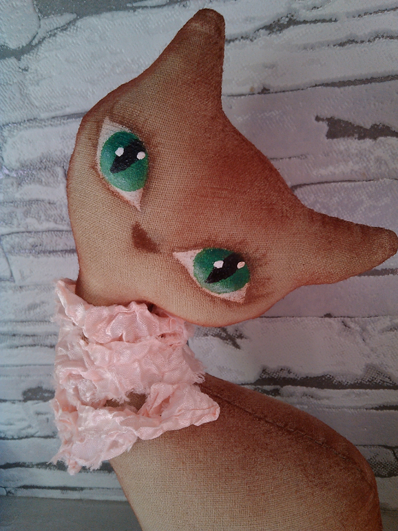 Для этой кошечки я брала обычный лён, тонировала его кофейным раствором с добавлением клея ПВА. Глазки рисовала акриловыми красками, затемняла пастелью, а по швам прошлась обычной гуашью, т.к. коричневой акриловой у меня не было... Только полусухой кисточкой (сначала пробовала на обычном кусочке ткани, затем затеняла швы).