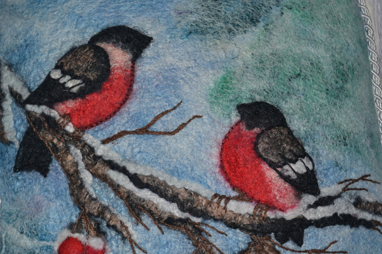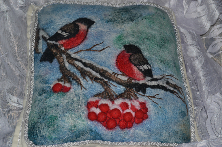 Только сегодня с Яниной говорили о нами любимых птицах снегирях и вот какая красота теперь у меня есть вот такая подушечка