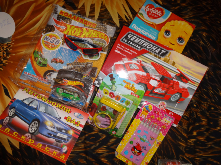 Васины подарки - просто набор гонщика! Очки вообще суперские!, конструкторы у нас всегда в фаворе, и набор натуралиста тоже очень понравился!