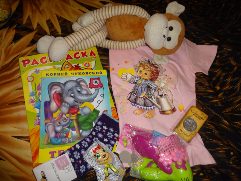 Вот Олечкины подарочки - маечка просто милейшая! :) И обезьянка-обнимашка :) А ещё монетка на счастье!