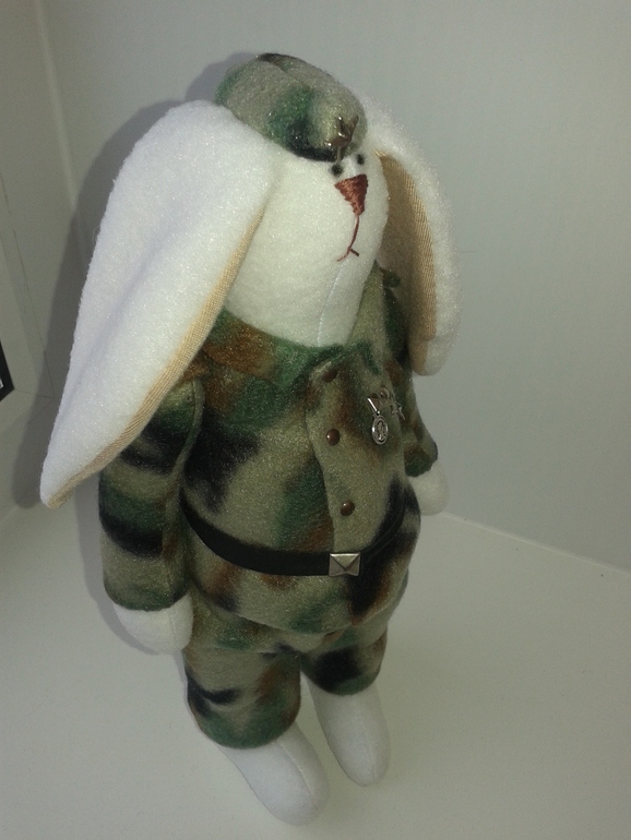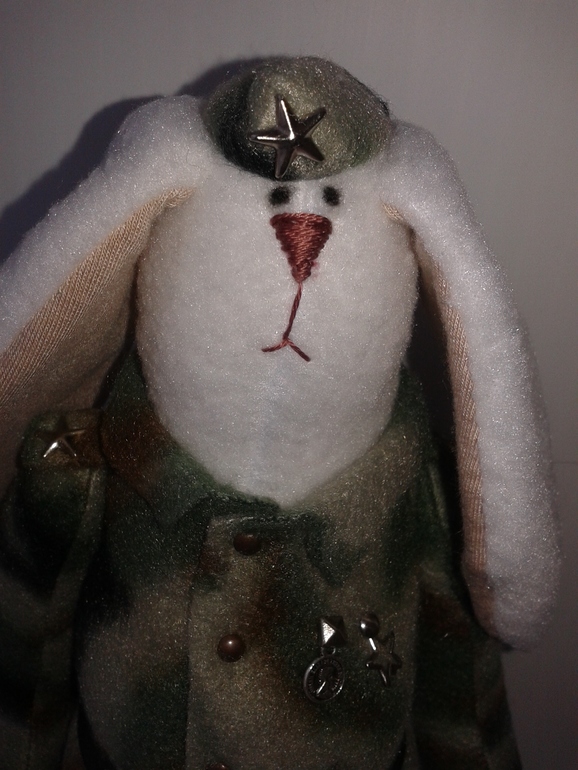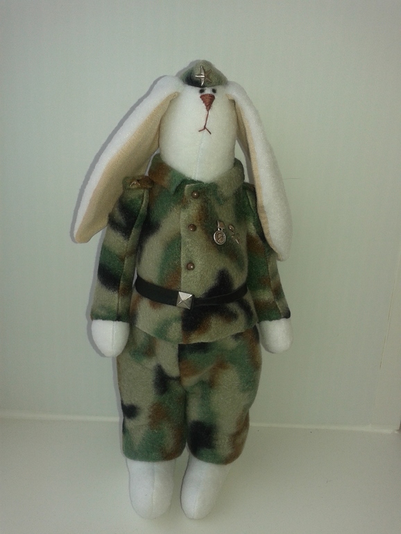 Мягкие игрушки-зверушкиЗахотелось сделать что-то не совсем обычное к 23 феврвля. В результате родился Зай-защитник отечества. Принесла на работу, стали выяснять звание... Первая версия - майор так как на погонах 1 звездочка. Вторая версия - генерал-майор, потому что звездочка крупнее чем у просто майора. Пришел военрук и категорично заявил что это народный маршал!!! Звезда большая (во весь погон)-маршал, а народный потому что в полевой форме значит близок к солдатам))))