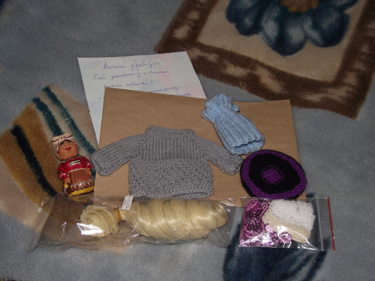 душевное и тёплое письмо с тёпленькой одёжкой, трессы для куклят, кружавчики и милая глиняная бабулька, определила её к совам на получку)