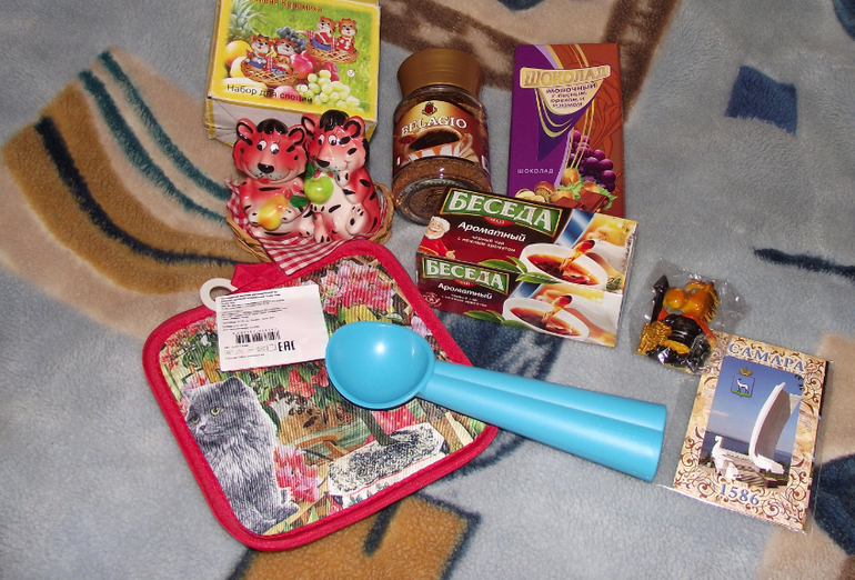 Ну а сейчас разные разности для дома - на кухню наборчик солонок в виде тигруль, прихваточка и если я не ошибаюсь, то ложечка для мороженого, чтоб шарики делать...если это действительно она, то ты прям прочитала мои мысли, искала у нас перед новым годом, но не нашла, а тут вот такой презент... ну вот как можно было так угадать?!? чаёк, кофеёк и шоколадочка, ну и подарки моему холодильнику -магнитики)))