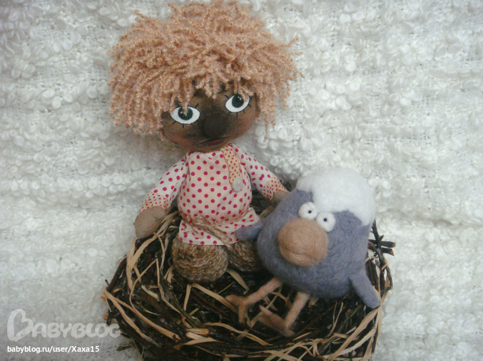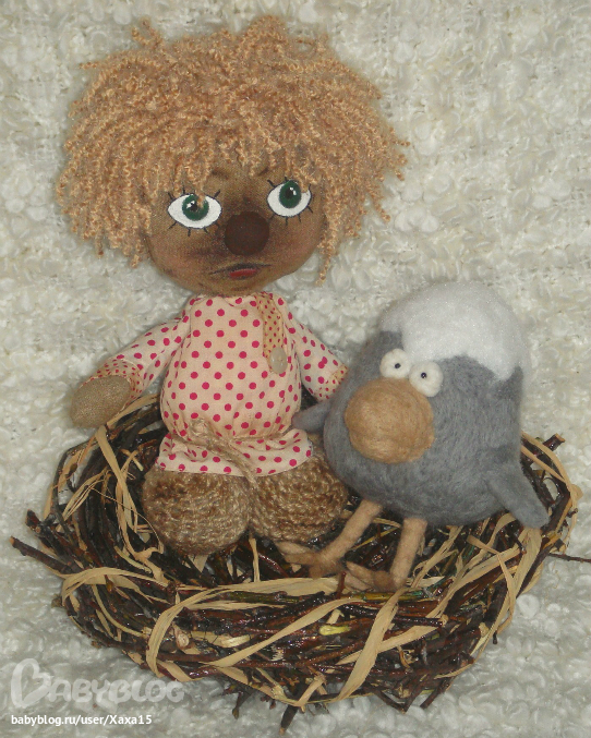 Хороши, как всегда!!! И Кузя, и гнездо... А птица-то какая!!! Не вороненок! Почти орел!!! Ниточки узнала, из которых волосы сделаны)))). У меня в запасниках тоже такие есть.