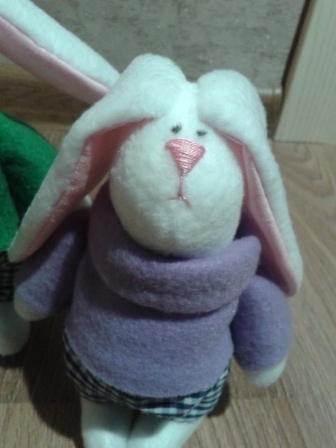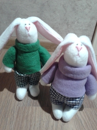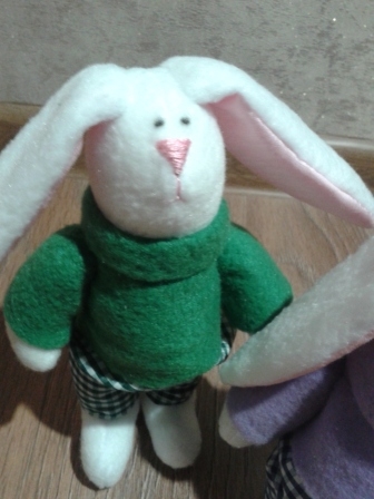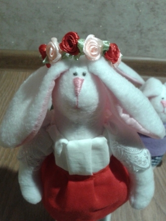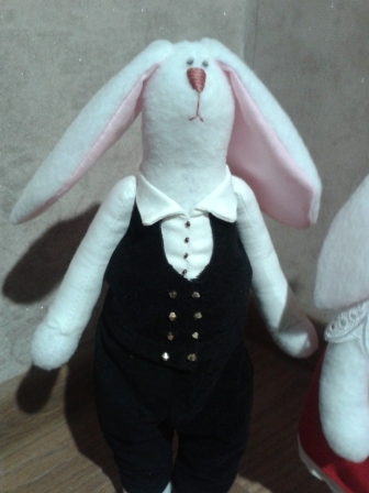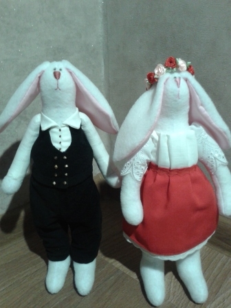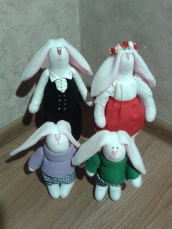 Мягкие игрушки-зверушкиПоступил мне недавно заказ на заек. В первый момент я была несколько удивлена пожеланием заказчика. Нужно сделать 4 зайки - семью: 2 детей мальчиков, мама и папа. Необычность в том что мама украинка, а папа бретонец (уроженец провинции Бретань, Франция) Пришлось заморочиться костюмами. С украинкой все более или менее понятно: красная юбка, пышные рукава и веночек, а вот бретонец меня озадачил. После "совещания" с заказчиком было решено нарядить его в черный костюм жилетом. Зайки эти поедут в подарок во Францию)))