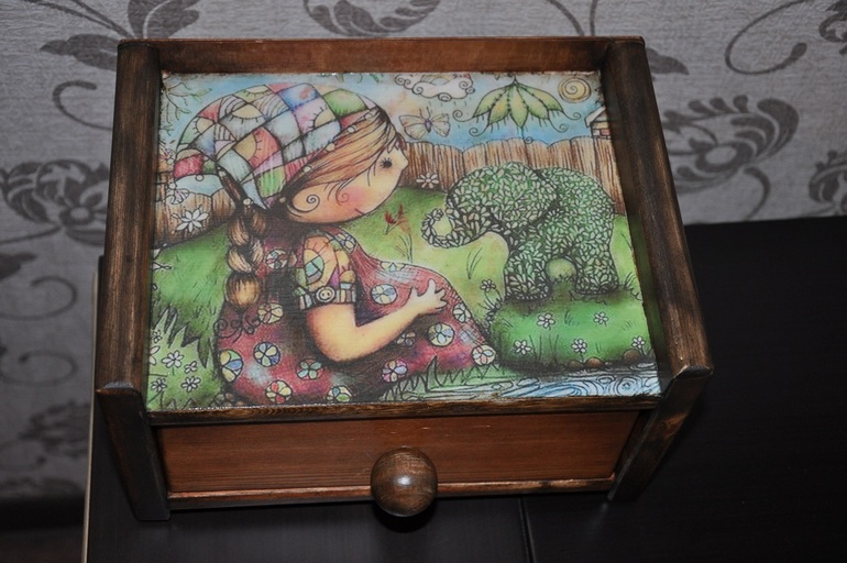 Еще одно творение Люси, это потрясный короб. Это шедевр. Он благородный, основательный такой, очень красивый короб для чайных пакетиков. Как он пахнет, ммм! Уложила туда пакетики, поставила на видное место, любуюсь хочу. И картинка очень мне нравится! Довольная я как слон на этой картинке)))