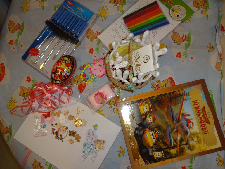 И папе подарочки - отвертки, и деткам фломастеры с раскрасками, браслетики, книжка просто супер! И моему хомяку в миленькой коробочки пуговички, ленточки и классные подвесочки!