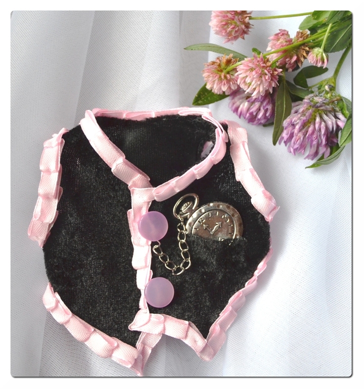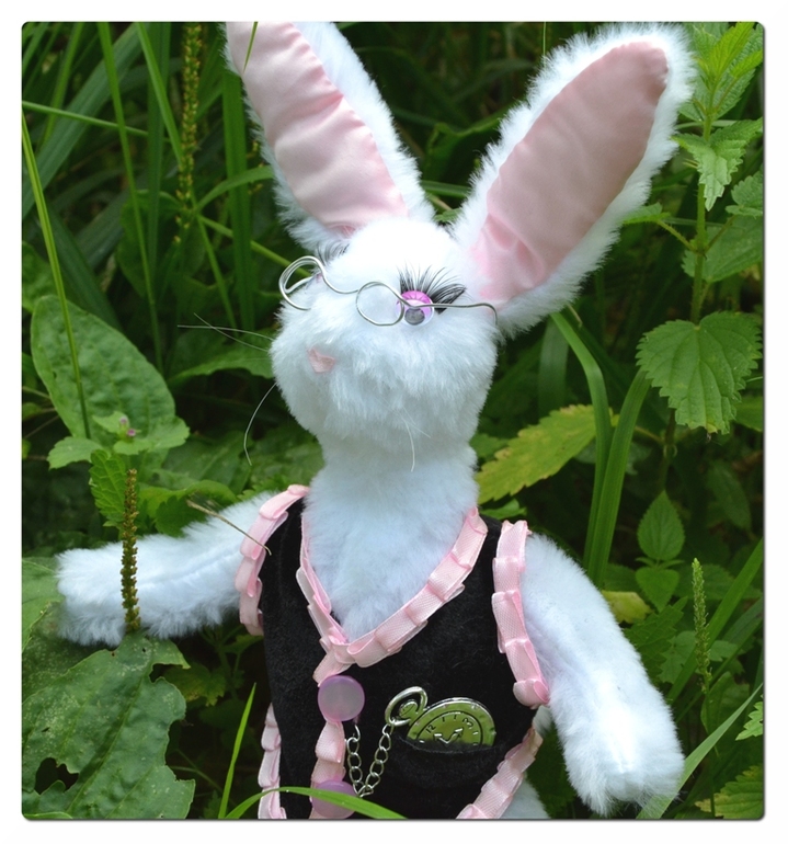 Во-вторых, в композицию входит Белый Кролик. Он сшит из искусственного меха. Н Кролике велюровая жилетка, украшенная лентой. В жилетном кармане кулон в виде часиков.