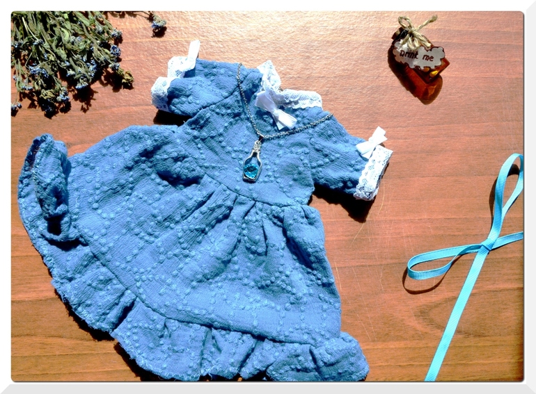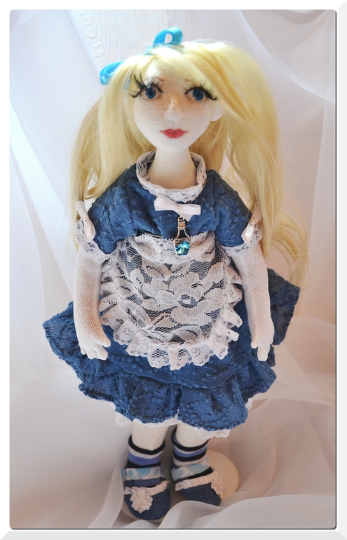 На ножках туфельки и носочки. Из украшений на Алисе кулон в виде бутылочки.