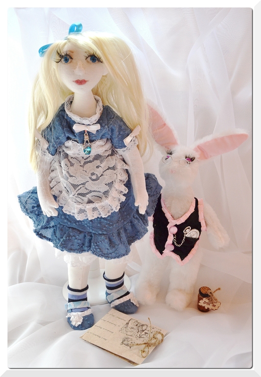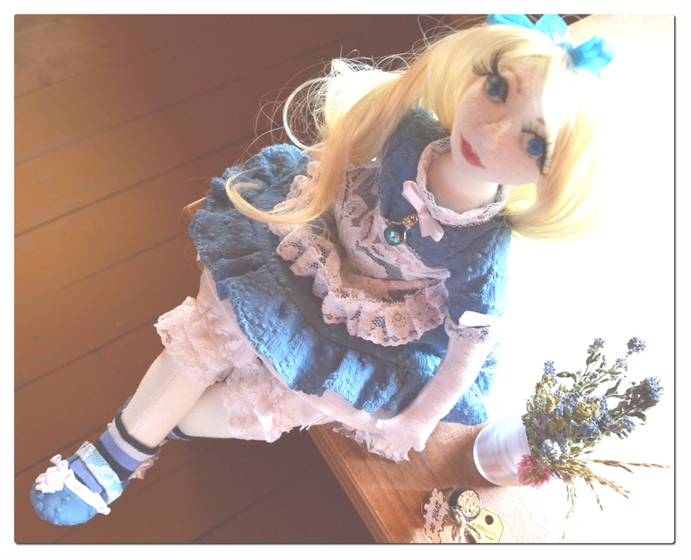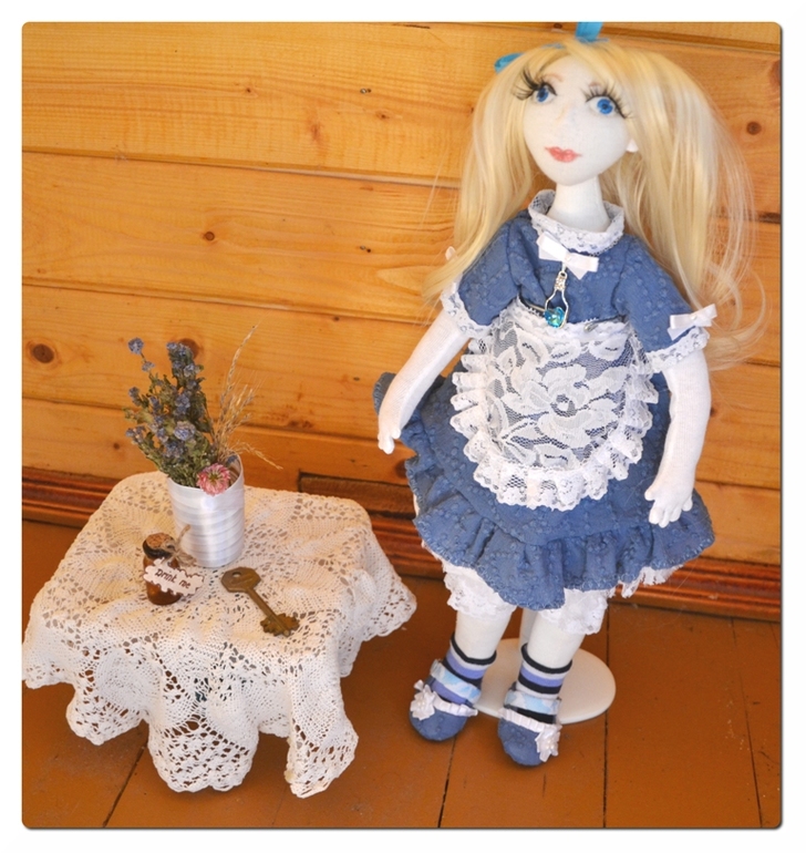 В кокмпозицию входит, во-первых, сама Алиса - текстильная куколка. Ручки-ножки у куколки подвижны, пальчики сгибаются и способны удерживать мелкие предметы.