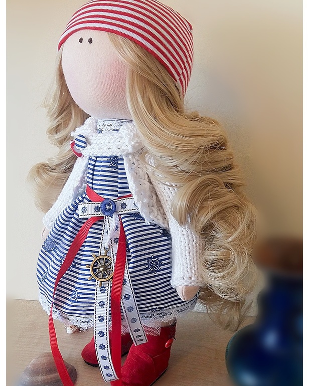 Летняя куколка-морячка в замшевых сапожках и лёгкой вязаной кофточке. Рост девочки 30 см. Она самостоятельно стоит без опоры. Девочка свободна. Цена малышки 3200.
