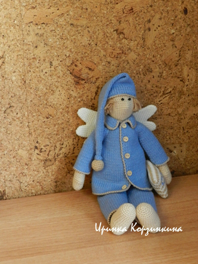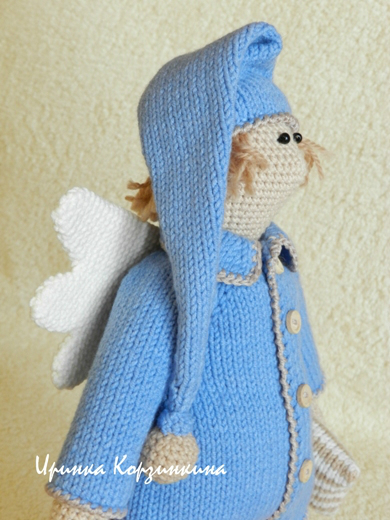 Пижамка связана спицами из хлопка с акрилом. Курточка расстегивается, пуговки деревянные. Снимается частично. Штанишки и колпак не снимаются. Кончик колпачка утяжелен металлическим гранулятом. Крылья на лямках.