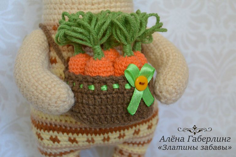 В придачу с зайцем даю сумку с 5 морковками, чтобы было что поесть, пока будет ехать от меня к Вам =) Морковь связана из хлопковой пряжи. Малыш может её посчитать, покормить зайца и другие игрушки.