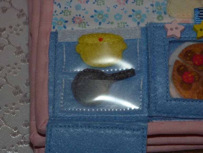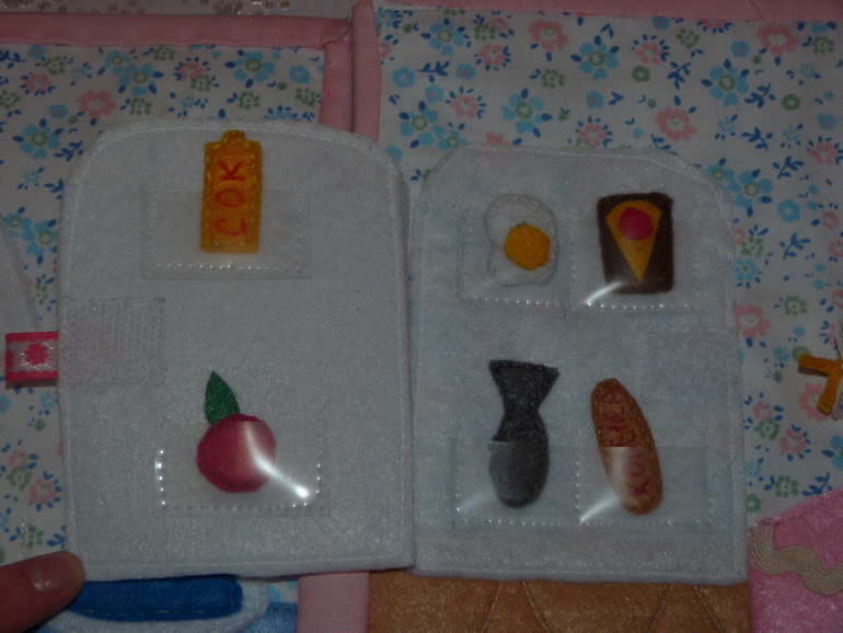 Есть шкафчик для тарелок. Шкафчик для кастрюли, сковороды.Есть полотенце, под раковиной - мусорное ведро, на плите стоит чайник, а в духовке жарится ароматная пицца.Пицца разделена на 4 кусочка, хватит всем ! (кусочки на липучке)Холодильник забит едой. Сок, яблоки, колбаса, бутерброд, яичница. Есть и угощение для любимца.Наступает время обеда. Стрелки на часах в столовой двигаются.![]()
