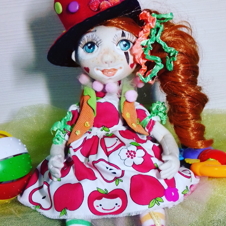 Клоунесса-текстильная каркасная кукла с объемным лицом. Коленочки, локоточки и пальчики сгинаются. Изготовлена из качественного трикотажа, хлопка корейского фетра. Куколка стоит с опорой и уверенно сидит. Обувь сделана из мягкого кожзама. Роспись лица вручную акриловыми красками и пастелью. Платье не съемное, а фрак можно снять. Подставка и кольца предоставленны лишь для фотосессии.