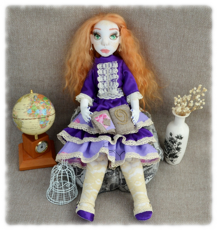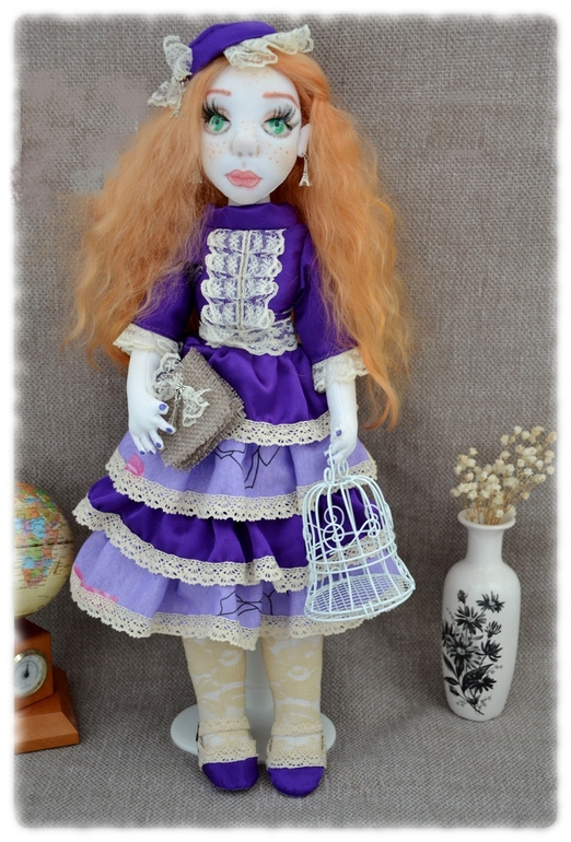 Текстильные куклы (кроме вальдорфских)Текстильная куколка. Волосы - кудри ангорской козочки. Личико объемное. У куколки есть шляпка, платье, белье, чулочки, туфельки, клетка для птички и текстильная книжка. В ушках сережки в виде Эйфелевой башни. Такими же башенками украшены шляпка и книжка. Кому интересно, прошу под кат.