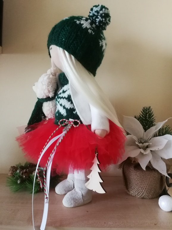 Ещё одна новогодняя или рождественская куколка. Высокая получилась барышня, 35 см. Но за счёт того, что на ней кеды, стоит устойчиво. Мишка пришит, как впрочем и вся одежда :)