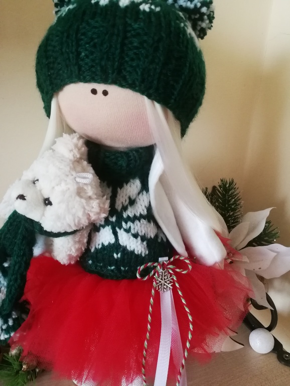Текстильные куклы (кроме вальдорфских)Ещё одна новогодняя или рождественская куколка. Высокая получилась барышня, 35 см. Но за счёт того, что на ней кеды, стоит устойчиво. Мишка пришит, как впрочем и вся одежда :)
