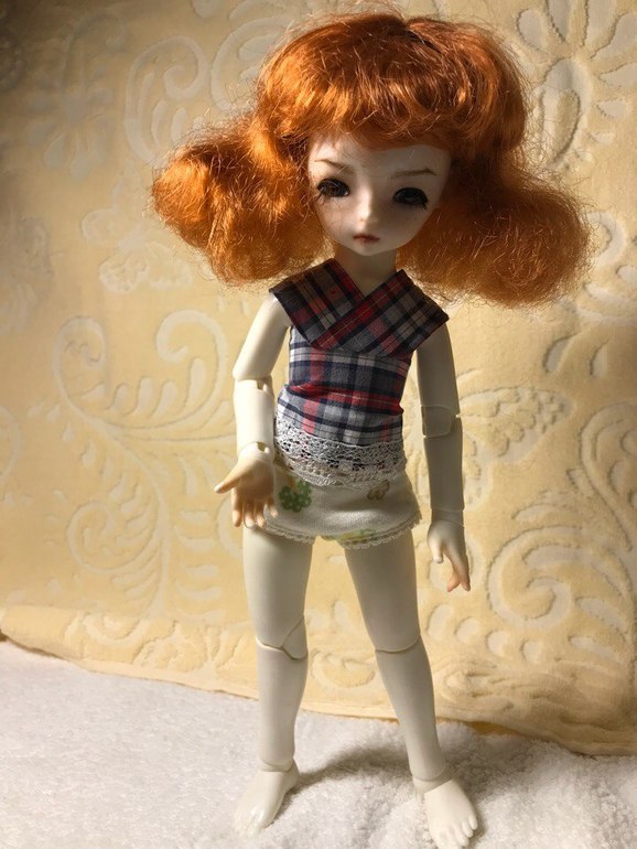 На этот раз я сшила Лине сарафанчик, точнее, перешила тот, который делала сразу после её у меня появления 1,5 года назад. Юбочка меня вполне устраивала, но вот верх... скажу только, что для его надевания приходилось снимать у куклы голову, м-дя. Итак, я переделала верх сарафана в топ, получив комплект из юбки и маечки. Маечка теперь застёгивается сзади на "пуговки" из бусинок и петли из нитки-резинки:
