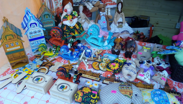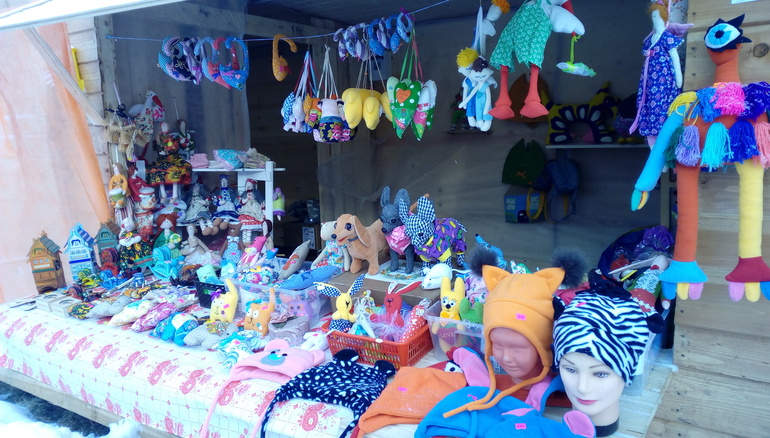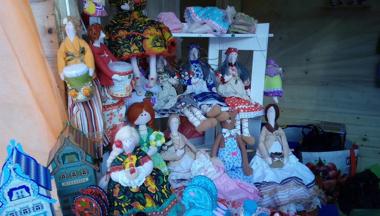 По ярмаркам обычно ездим с приятельницей,которая тоже шьет кукол и не только. Ларечек у нас один на двоих,все игрушки вперемешку.)) Никакой конкуренции у нас нет,я считаю что на каждый товар есть свой покупатель.