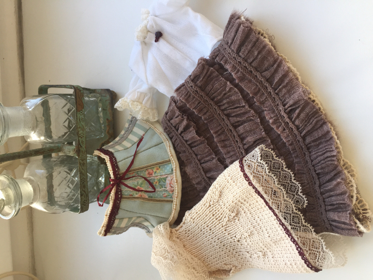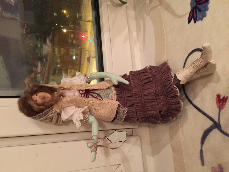 Мне очень понравилось работать с юбкой. Материал типа марлевки. Даже не резать, а рвать- эффект понравился. Опять же - повторила вышитые губки и выдающийся нос. Эта куколка и Элизабетт были экспериментальными моделями - носатыми. Но эти носы как раз очень живо подчеркивают их характеры))).