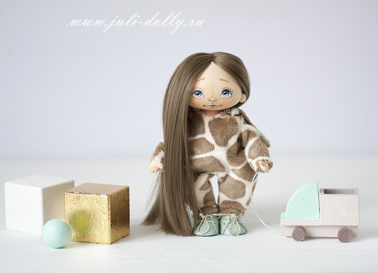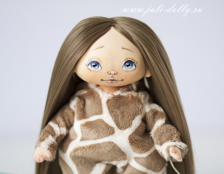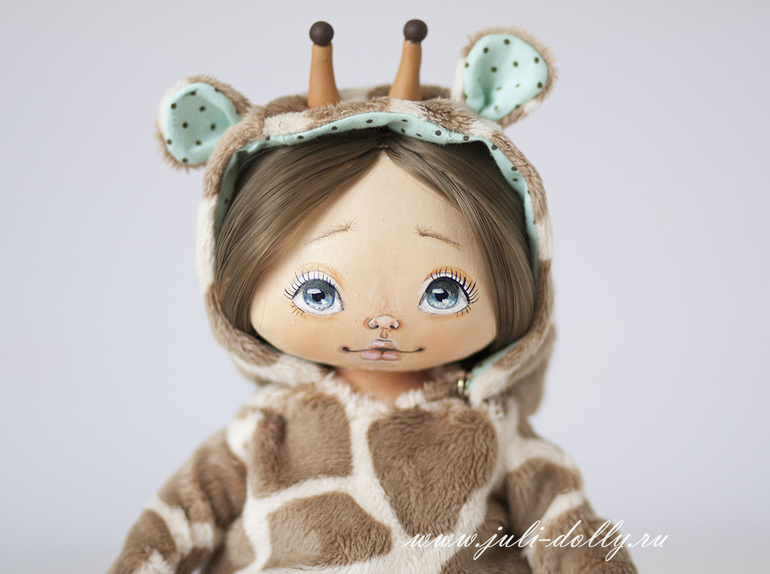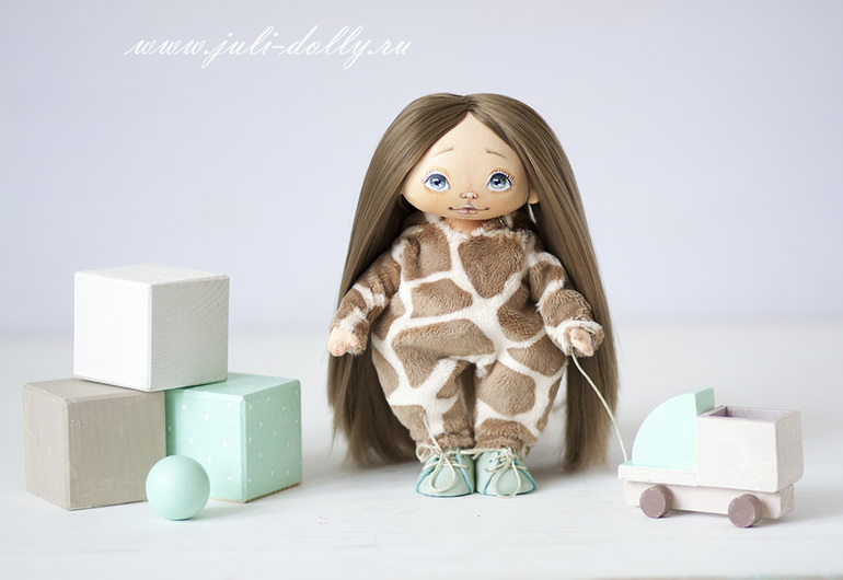 Текстильные куклы (кроме вальдорфских)Вот такая милашка в комбинезончике жирафика родилась на свет! Девочка ростом 20 см. Комбинезон снимается, ботиночки тоже. Рожки на капюшоне сделаны из полимерной глины.