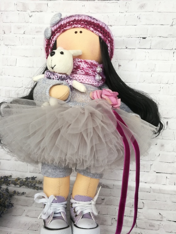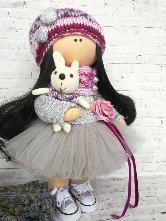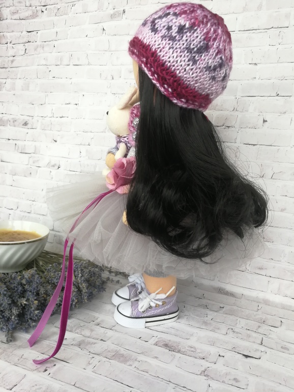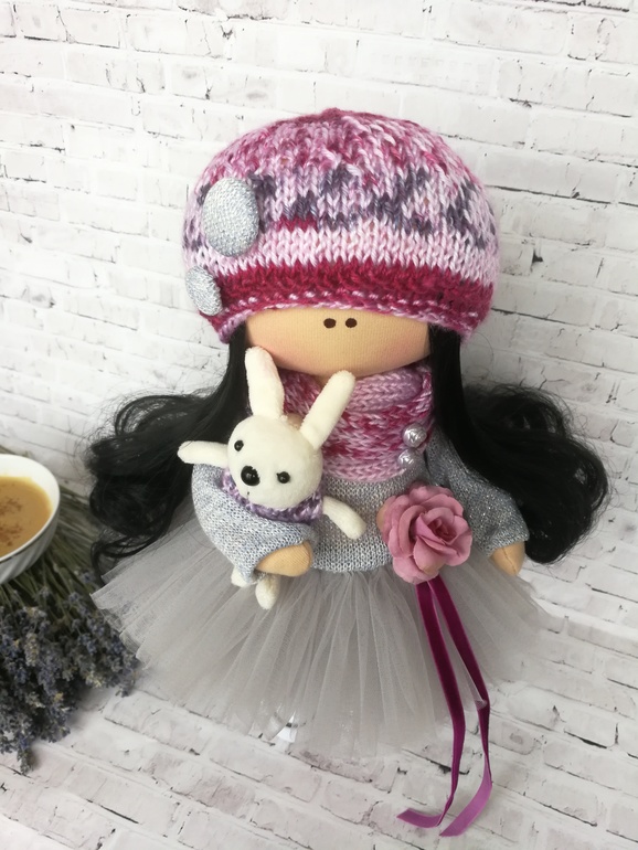 Рост куколки 33 см. Одежда и шапочка не снимаются. Волосы можно заплести в косички или собрать в два хвостика.