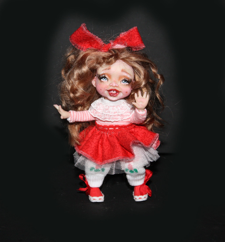 Маленькая модница-куколка на каркасе размером 16 см, голова, ручки.ножки- запекаемый пластик, волосы-натуральная шерсть ангорской козочки, роспись акрил, пастель, ручки,ножки. голова-подвижные))малышка ищет любящую хозяйку, хочет стоять на полочке и радовать окружающих своим позитивом)