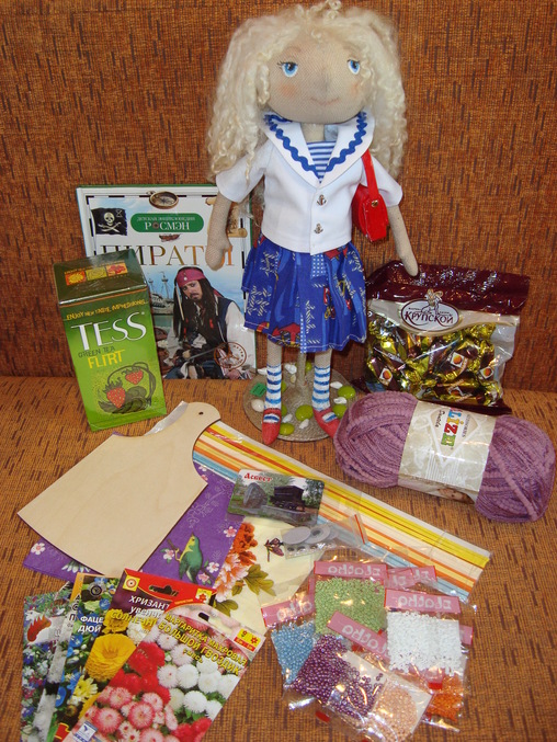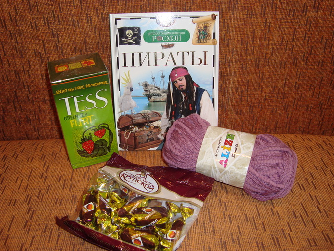 Энциклопедия для сынули, вкусные конфетки (мои любимые;)) спасибо!), чаек и нитки (давно хотела попробывать связать из таких ниток шарфик).