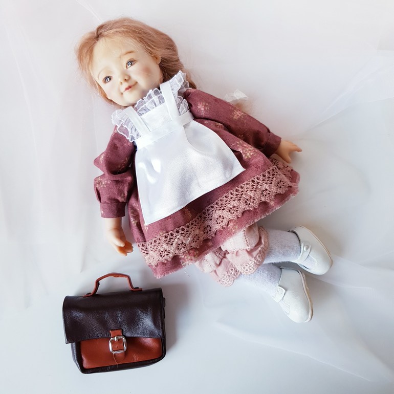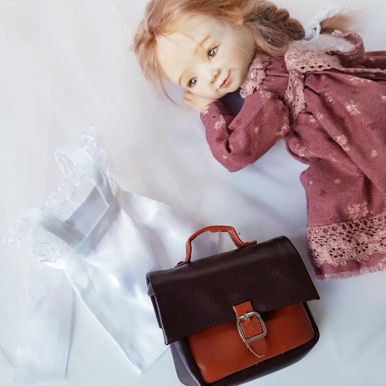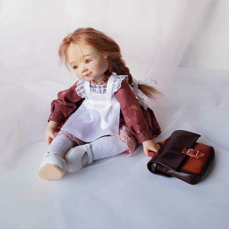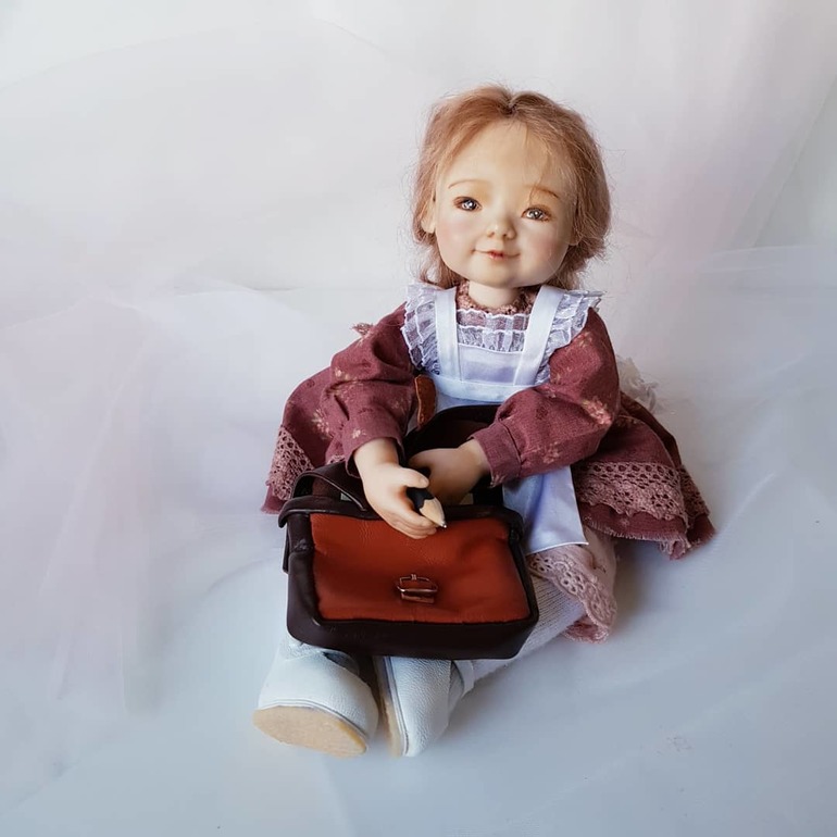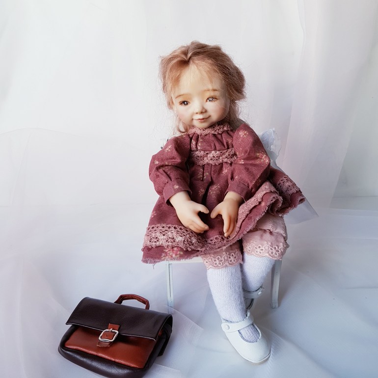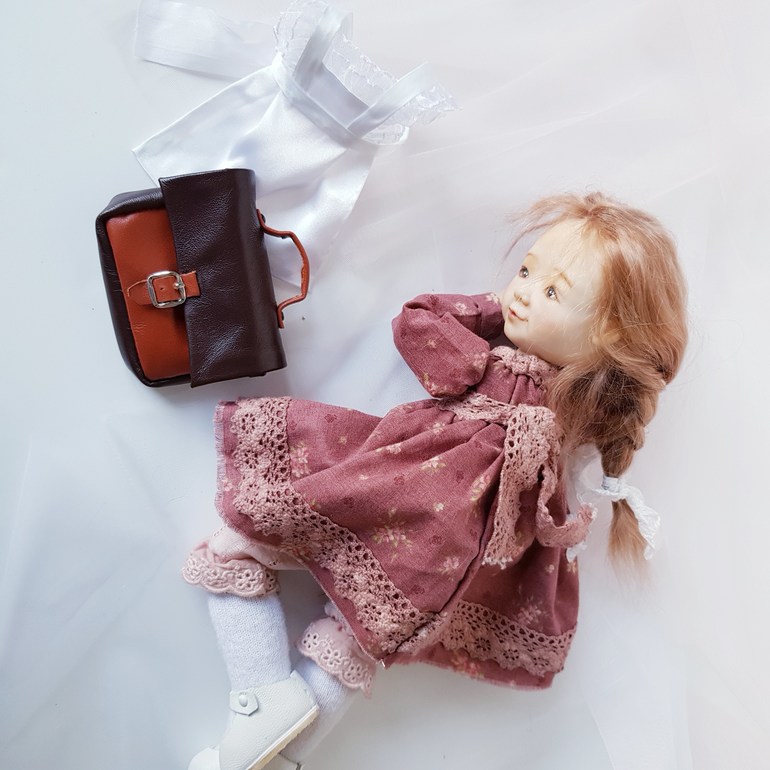 Малышка сделана из полимерной глины, тканей, шерсти ангорской козочки, рюкзачок из кожи. Рост 32см. Идёт вместе с красивой подарочной коробочкой)