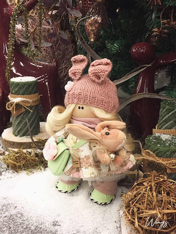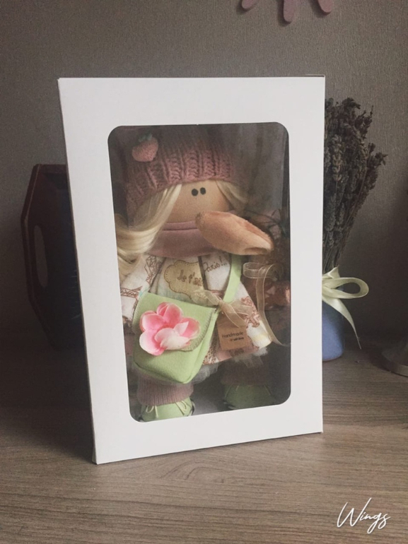 Рост около 25 см. Стоит сама. Платье из льна, сумочка открывается. Шапочка и одежда не съёмная. Упакована в коробку. Цена 2500.