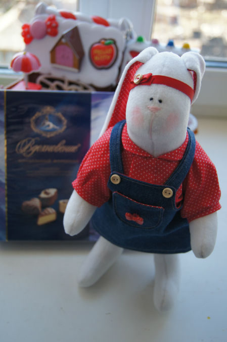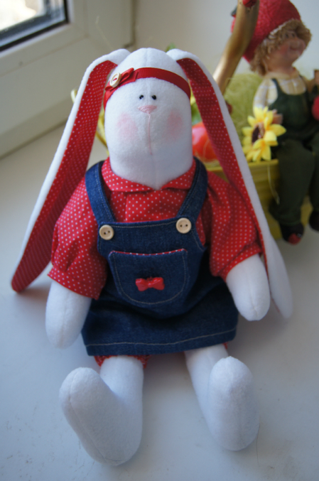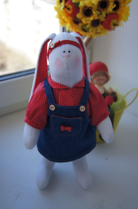 Вот наша Зайка -модница. Она умеет и сидеть ,и стоять. На ней классный джинсовый сарафан и горошковый комбезик. Вся нарумянена и пахнет вкусно-вкусно !!!