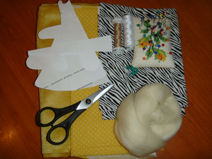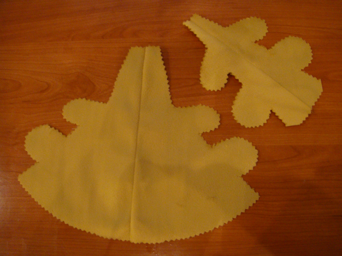 Затем на машинке прошиваем оба шва, которые соединяют половинки. Больше машинка мне не понадобилась:), всё шила руками:). Вырезаем детали, не забыв оставить отступы для шва.