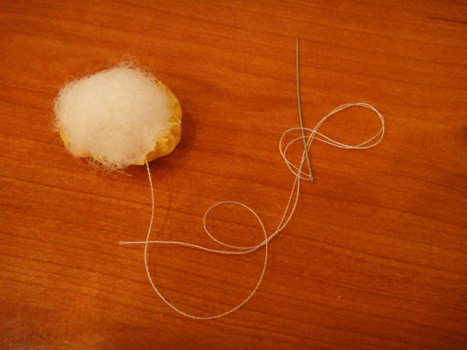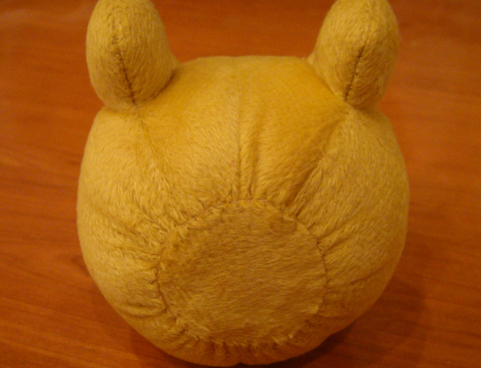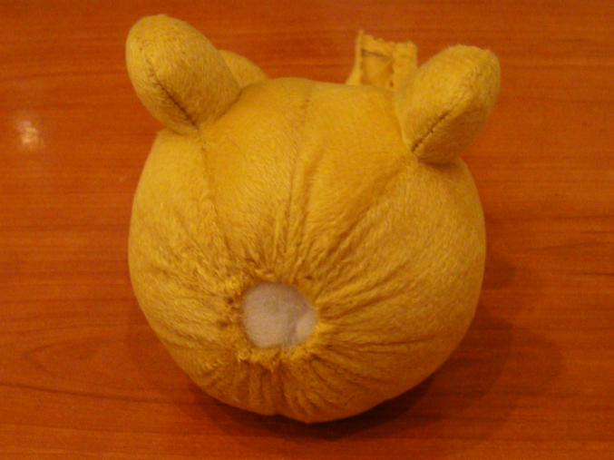 Из хлопка вырезаем овал, который раза в два больше предполагаемой мордахи. По краю прошиваем наметкой, в центр кладем кусочек синтепона и стягиваем, добавляем набивку до плотности и крепим нитку.