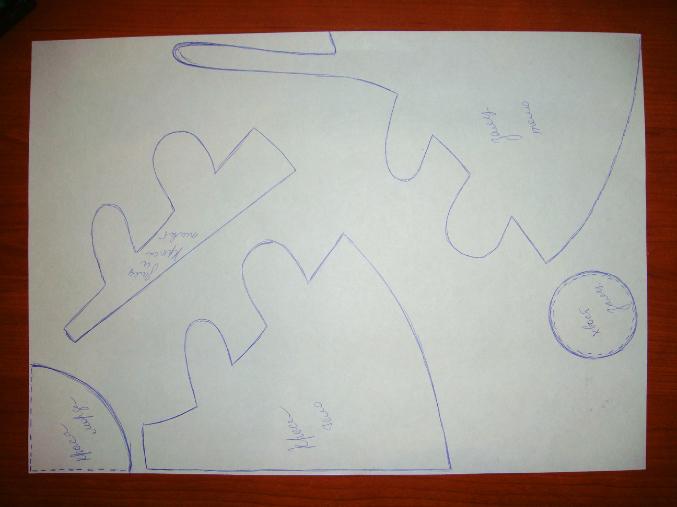 Совмещаем детали туловища (лицом к лицу), лапки фиксируем для удобства булавками (забыла сфотать), и швом назад иголка прошиваем с одной и другой стороны.