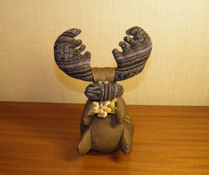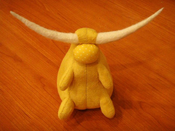 Рога высохли. Прикладываем их к голове под свободный конец "шеи", подворачиваем срез и пришиваем потайным швом. Сверху по кругу пришиваем мордочку.