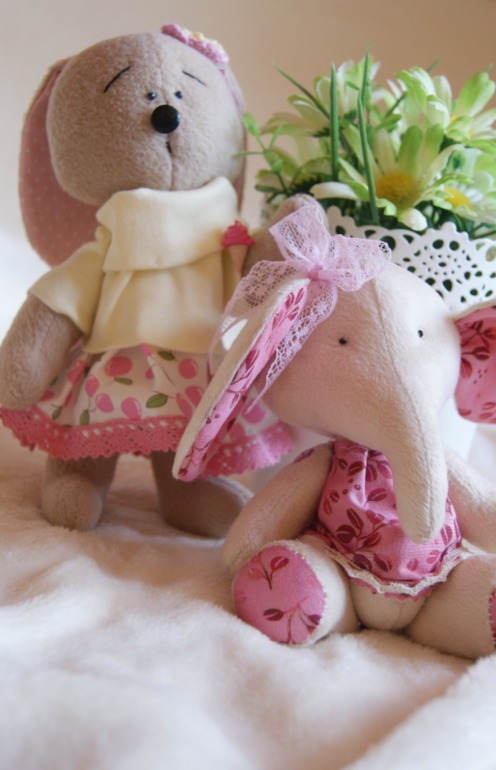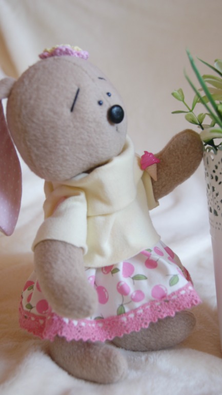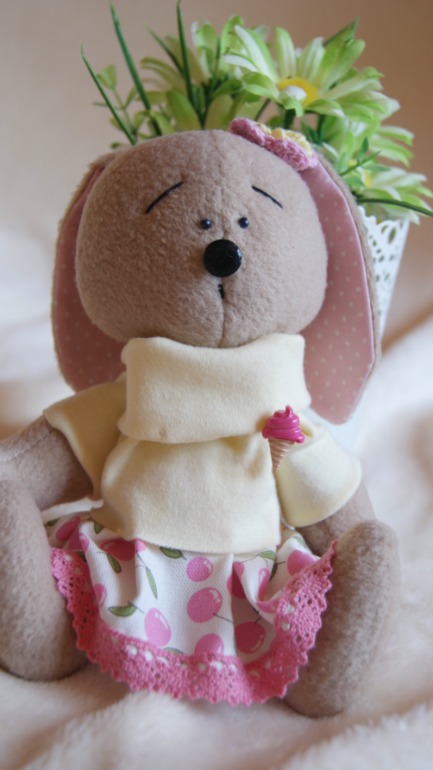 Мягкие игрушки-зверушкиПривет, рукодельнички! Покажу вам сегодня милую заю, которую сшила для своей доченьки. Она её очень любит, таскает везде с собой))) Сшита из флиса, ростиком 20 см, носик-пуговка,кофта- трикотаж, юбка-лён с вишенками) на голове заколочка с вязаными цветами, на кофта брошка- мороженка :)