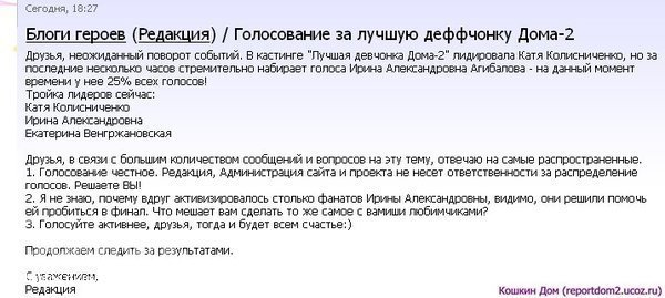 Редакция посидела, посчитала и решила, что плохо голосуют, а надо ИА всунуть в конкурс, да побольше голосов ей дать, чтоб уже проголосовавшие еще раз за своих любимчиков проголосовали!