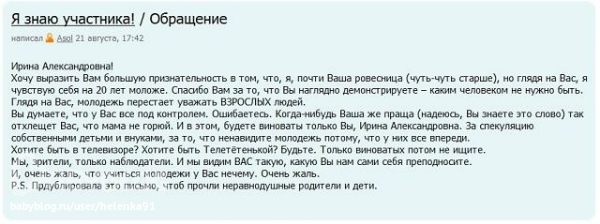 о как хорошо написала Asol! я к своиму стыду не знаю что такое "праща" и вообще не люблю судить людей и не люблю,когда другие пишут "вот вам еще аукнется".. ну это тема для другого разговора. но вот, то как охарактерезовала ИА Asol мне очень понравилось. Согласна на 100%.