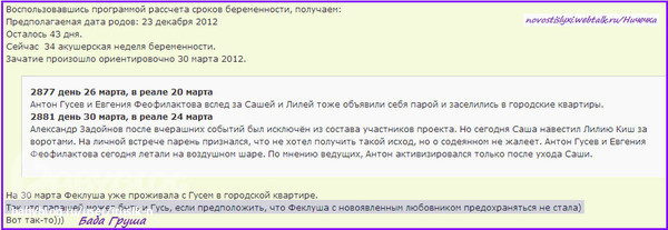 Даже если это и так, то надо быть полной дурой чтобы вот так вот залететь или слишком расчетливой, только вот какой расчет она сделала на Татошку не понятно, он вроде не богат!? Копалась, копалась Фифа в поклонниках, искала себе олигарха, а нашла глупенького Татошку!!! Тут наверно точно расчет, вот только с чьей стороны, может проект выгодные условия предложл, типа если поженитесь и ребенка родите, то бобосики у Вас будут, поэтому и повелись!!! Но что то тут не то, это точно!!!!