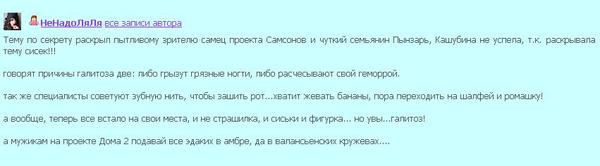 Ну вчера ж Самсон всем по секрету- что у Кашубиной изо рта пахнет ,что все парни кто с ней были про это говорят и потому бегут от нее)Вот блевотня..