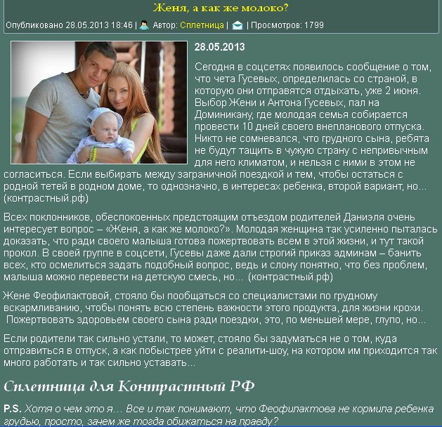 мне что то не вериться что она со своей силиконовой грудью вообще кормила, и как то в эфире она устроила скандал Антону за то что ей надо было кормить, а он хотел гулять, на что он ей сказал что покормит малого на улице, тогда стало понятно что она не кормит а только пиарится, как он собирался ее грудью кормить на прогулке????????? теперь понятно почему она тогда так орала на него, не хотела что бы очередная ее брехня раскрылась, а он одной фразой все карты раскрыл.... фу такая мерзкая двуличная брехливая