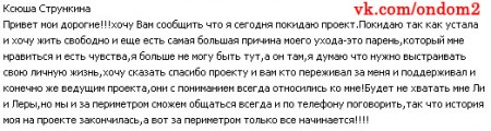 Тогда ведущие разрешили вернуться в периметр. Теперь всё по-другому, в ближайшее время Оксана на проект не вернётся, да и ценность её как персонажа теперь не такая высокая. Организаторов вполне устраивает Оксана Ряска, как равноценный персонаж и хорошая замена. Можете убедиться сами — после эфира с уходом Стрункиной, всё больше эфирного времени на ТНТ будет у Ряска (фамилия не склоняется), которая будет лезть во все конфликты/пары/отношения в доме 2.