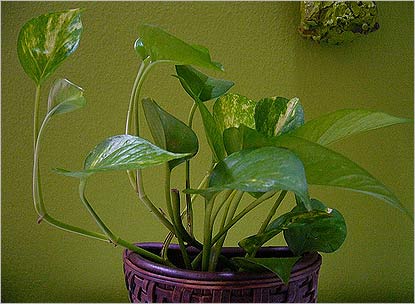 Этот цветок мне помнится еще с детского сада. У него плетущийся стебель, напоминающий лиану, на котором располагаются сердцевидные листья сочно-зеленого цвета с белыми вкраплениями. Чтобы листья были крупными, а стебель толстым, оно должно стоять в достаточно освещенном месте. Поливать цветок нужно по мере высыхания земли. Как только у вас будет появляться время, обязательно протирайте листья или опрыскивайте — на эти действия растение ответит вам ростом и красотой. Сциндапсус может достигать полутора метров в длину, его стебли можно пускать виться по стене. Кстати, если вы его расположите на кухне, то он будет листьями поглощать угарный и углекислый газ, никотин и даже фенол, формальдегид, выделяющийся из мебели.