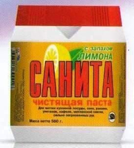 Сейчас посмотрела у себя, теперь она называется чистота, выпускает ООО Европейская химическая компания, думаю, что санита как на вашем фото небудет отличаться, сама паста серого цвета, я с детства ее помню еще. Продается в самых обычных хозмагазинах и стоит рублей 30