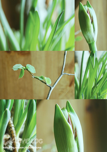 Зеленое окошко. Амариллис, нарцисс, ветка липы, гиацинты в корзинке.