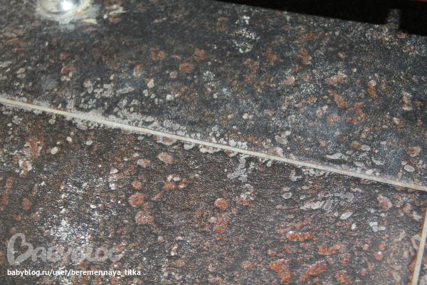 Выводим пятна, отстирываемПривет! Девочки, помогите, пожалуйста! На плитке пола вдоль швов белесые пятна, либо от затирки, либот от плиточного клея (теперь не понять, от чего, ремонт был давно и рабочих не найти)). Чем только ни терла - и железной щеткой, и шуманитом пробовала - не берет... В строительных спрашивала, никто ниче сказать не может.